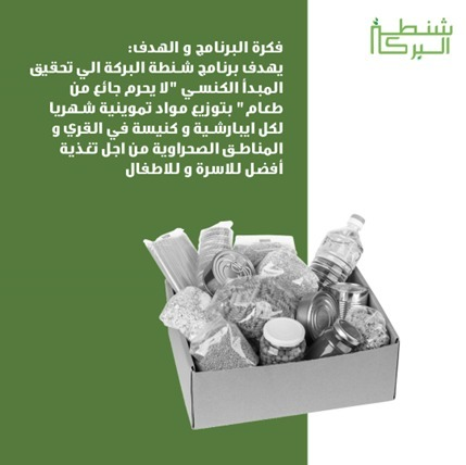 يهتم برنامج شنطة البركة بأن تحصل أسر الرعاية على تغذية أفضل و ذلك من خلال توزيع حقائب شهريا تحتوى على ً المواد والعناصر الأساسية من الغذاء (الأرز و العدس و الزيت و مستلزمات اخرى ضرورية ) – تساهم فى فتح باب رزق لأصحاب محلات العلافة والبقالين واصحاب محلات الدجاج واللحوم في القرى بشراء إحتياجات الشنطة منهم -يتم توزيعها فى القرى و المناطق الصحراوية